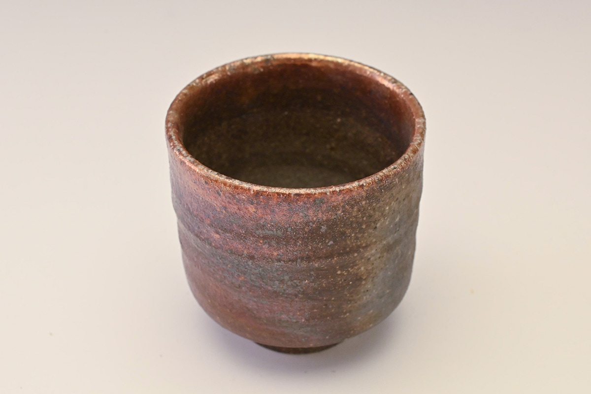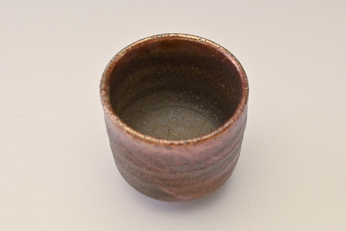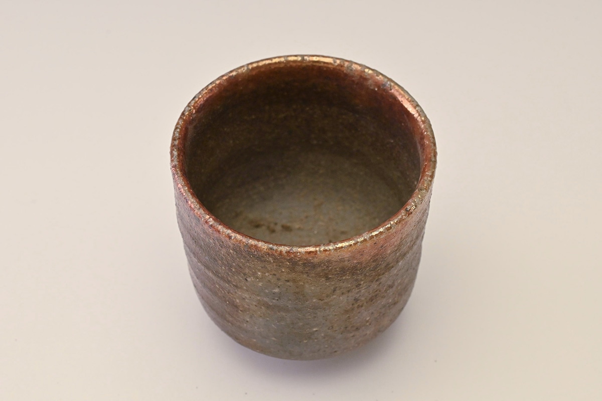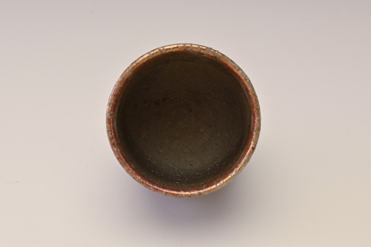 先代の窯主の手によるもので、窯変によってぐい吞の口縁が金色に変化した作品です。