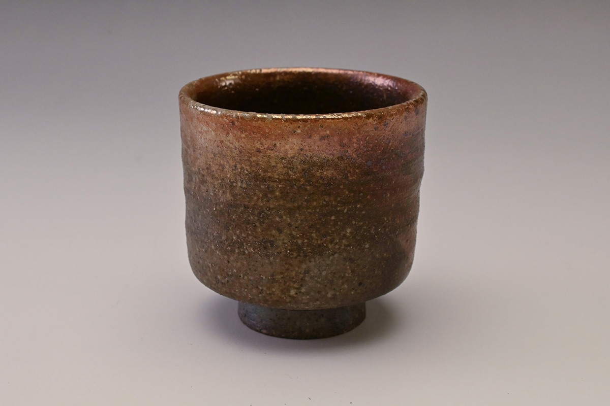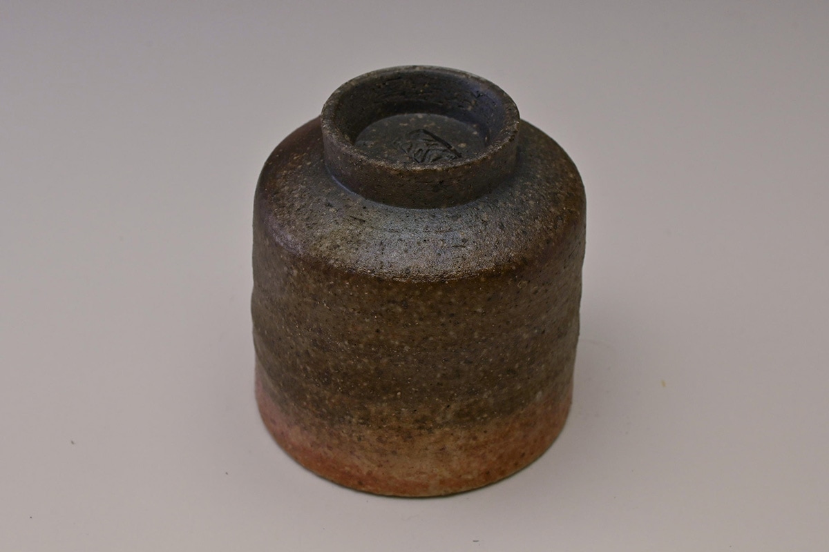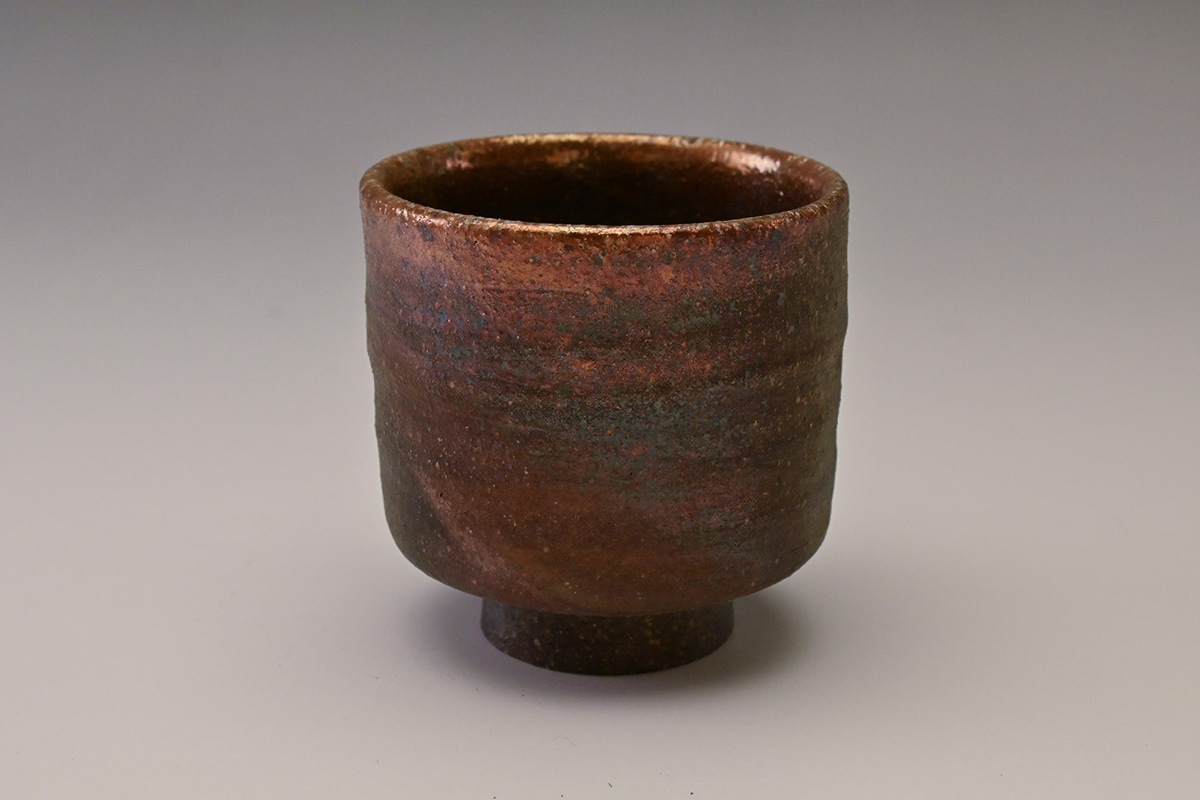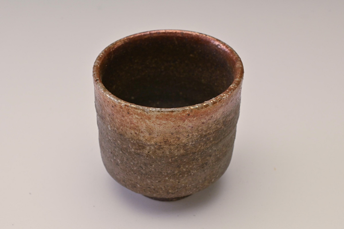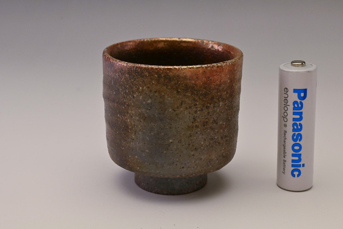 先代の窯主の手によるもので、窯変によってぐい吞の口縁が金色に変化した作品です。